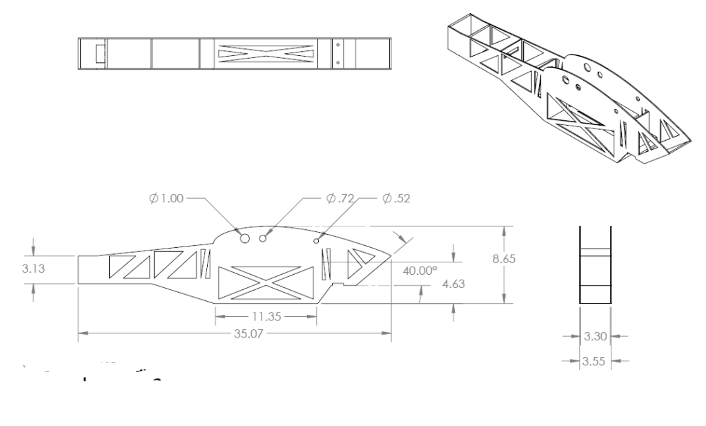 The choice of material for the focused on two main objectives: maintaining a large strength to weight ratio, and minimizing cost. Material options spanned three primary choices: metal, composites, and wood. Due to a weight limit of 55lbs, Metal was very quickly dismissed from my options because of it’s higher density. The use of composites was considered, however the high density of non-carbon fiber composites were a non-starter. The use of carbon fiber was considered, but was dismissed due to costs and concerns over manufacturability. Ultimately, a Higher strength birch wood laminate was chosen for structural components. The laminate used grain layers laid orthogonally to each other to have a uniform set of strength properties. An aerolite balsa was chosen for the majority of non-structural panels for it’s extreme low density. Beyond the wooden structure, monokote wrap was used to reduce drag.